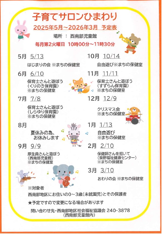 毎月第2火曜日の午前10時~11時30分まで、西南部児童館で子育てサロン「ひまわり」を開催しています。